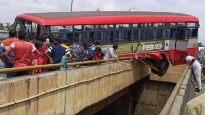 यात्रियों की सांसें थमीं: चालक ने बहाव में उतारी बस, पुल से लटकती रही गाड़ी