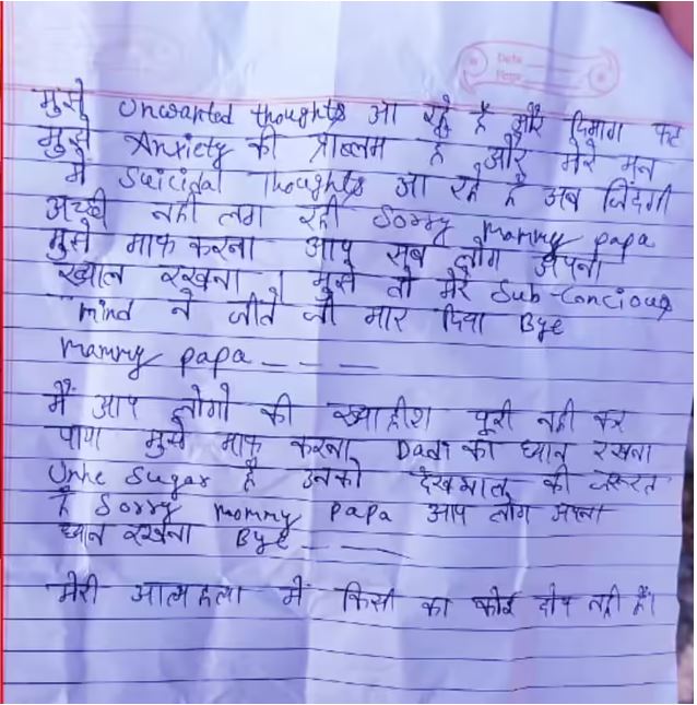 पुलिस को मौके से एक सुसाइड नोट मिला है, जिसमें स्वयम ने लिखा है कि मुझे अनवॉन्टेड थॉट्स आ रहे हैं। दिमाग फट रहा है। एंग्जाइटी की प्रॉब्लम है। मन में सुसाइड थॉट्स आ रहे हैं। अब जिंदगी अच्छी नहीं लग रही। सॉरी मम्मी-पापा। मुझे माफ करना... मैं आप लोगों की ख्वाहिश पूरी नहीं कर पाया। दादी का ध्यान रखना। उन्हें शुगर है... मेरी आत्महत्या में किसी का कोई दोष नहीं है।