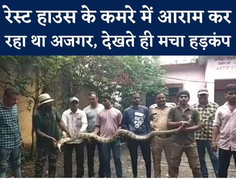 रेस्ट हाउस में फैली दहशत: शिकार की खोज में घुसे अजगर को रेस्क्यू टीम ने निकाला, दो लोगों को साथ मिलकर उठाना पड़ा