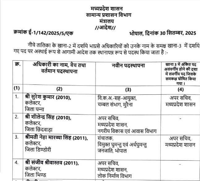 एमपी में 2025 बैच के IAS अधिकारियों की पोस्टिंग, प्रशासन को मिले नए चेहरे