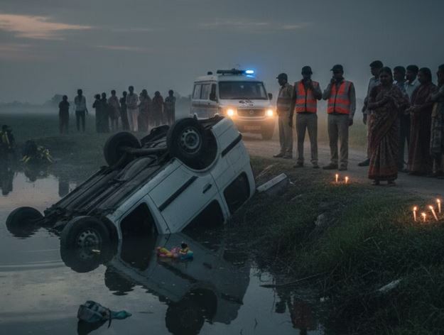 लखनऊ। उत्तर प्रदेश में सड़क हादसों का सिलसिला थमने का नाम नहीं ले रहा है। कानपुर देहात जिले में एक दर्दनाक दुर्घटना में एक ही परिवार के चार लोगों की मौत हुई। जानकारी के अनुसार, औरैया जिले का रहने वाला परिवार कल्याणपुर में एक रिश्तेदार के घर समारोह में शामिल होकर लौट रहा था। तभी सवई गांव के पास उनकी निजी वैन अनियंत्रित होकर सड़क किनारे तालाब में जा गिरी। बताया जा रहा है कि वाहन में कुल 11 लोग सवार थे। प्रत्यक्षदर्शियों के मुताबिक चालक ने वाहन से नियंत्रण खो दिया, इसके बाद वैन सीधे तालाब में चली गई और गहरे पानी में डूबने लगी। लोगों की चीख-पुकार सुनकर आसपास के ग्रामीण मौके पर पहुंचे और पुलिस को सूचना दी। शिवली थाना प्रभारी के नेतृत्व में पुलिस टीम ने तत्काल बचाव अभियान शुरू किया। जेसीबी मशीन और स्थानीय गोताखोरों की मदद से काफी मशक्कत के बाद वैन को तालाब से बाहर निकाला गया।