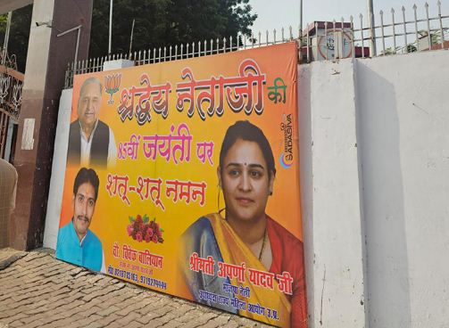 लखनऊ। यूपी में 20 नवंबर को उपचुनाव की वोटिंग है। सोमवार को प्रचार का आखिरी दिन है। रविवार को लखनऊ में सियासत की नई तस्वीर दिखी। प्रदेश भाजपा कार्यालय के मुख्य द्वार पर मुलायम सिंह यादव की बड़ी होर्डिंग लगी नजर आई। इसमें अपर्णा यादव की फोटो भी थी। अपर्णा मुलायम की छोटी बहू हैं।