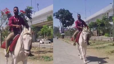 देवास में जुगाड़ का कमाल, घोड़े पर बैठकर ऑफिस पहुंचा बैंक कर्मी